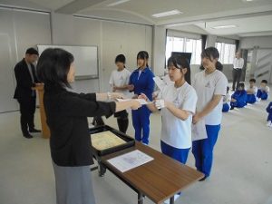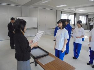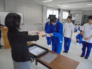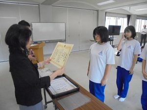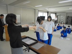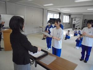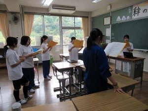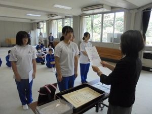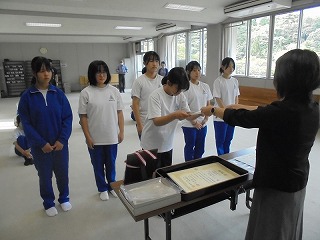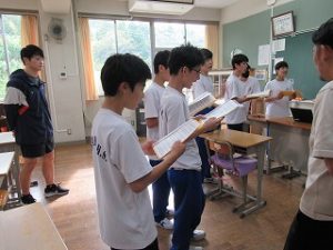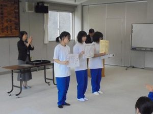 後期役員の任命が行われました。また、夏休み中に行われた各種コンクールと先日の交通弁論の表彰も行われました。多くの活躍が光る秋中生です。