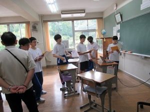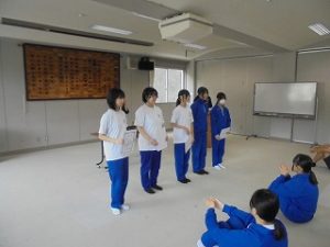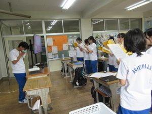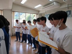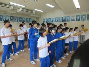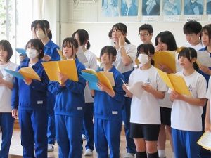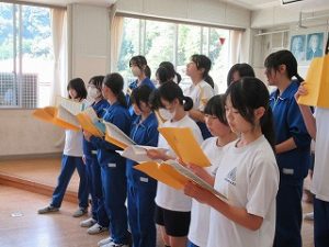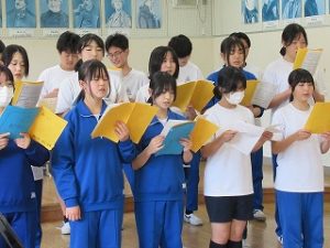 そして、掃除の前の時間帯で、市音楽会に向けた合唱練習も始まっています。3年生の朝光祭文化部門の生徒が中心になって練習を進めてくれています。朝や放課後、校舎内に生徒たちのいい声が響いています。