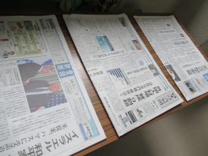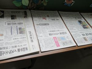 今年度もNIE指定校の関係で、6社の新聞(朝刊)が4ヶ月間学校に配達されます。同じ日の新聞でも、1面の見出しはそれぞれ違っていておもしろいです。読み比べもできるので、この機会に新聞に親しみ、社会の情勢を知ったり、読解力の向上を図ってほしいと思います。