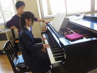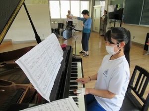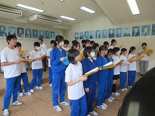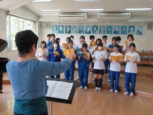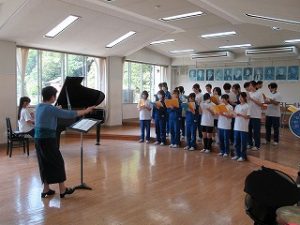 木曜日は音楽の先生がいらっしゃる日なので、昼休みまで先生に残っていただき、全校で合唱練習に臨みました。これまで自分たちでパート練習に取り組んできた「春に」の合わせ練習を行いました。良く声が出ていましたが、まだ音取りが不十分な部分があるようなので、リーダーも「これからパート練習で足りないところをしっかりやっていきましょう」と声かけしていました。