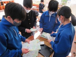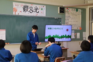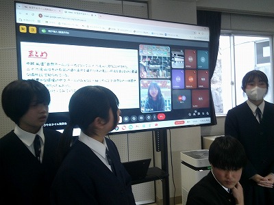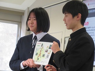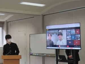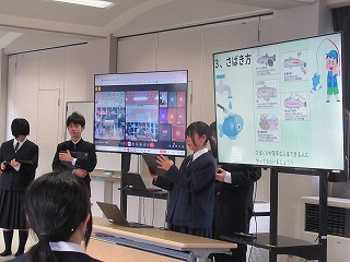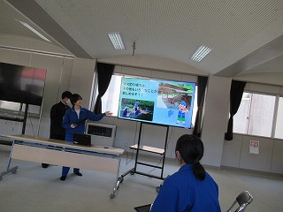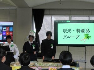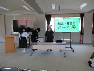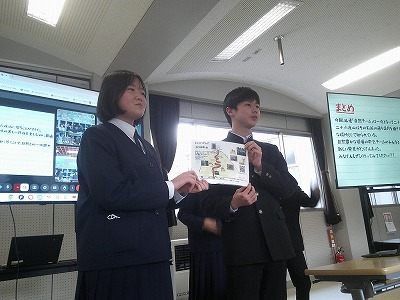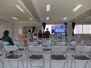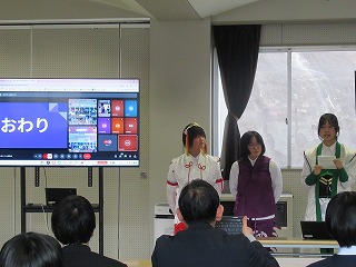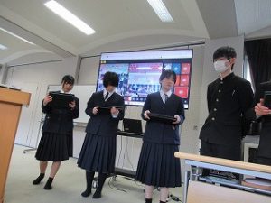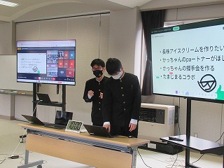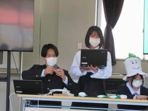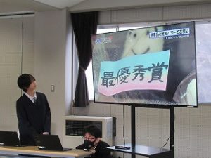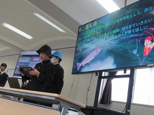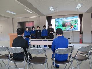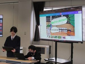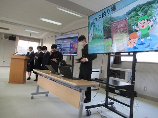 マス釣り場の紹介と二十六夜山登山についての2本立ての発表でした。マス釣り場では新しいテントサウナの紹介なども入っていて、誰もが「すぐに行ってみたい!」と思える内容でした。そして、生徒が作成したマス釣り場紹介動画は、超ハイクオリティーな仕上がりで、テレビCMで採用してほしいくらいの出来映えになっていました。釣り場の素敵なパンフレットも作成したので、後日生徒が釣り場を訪問し、お渡しする予定とのことでした。