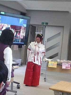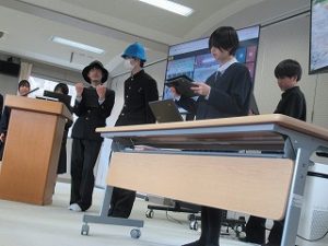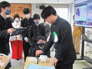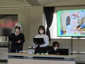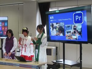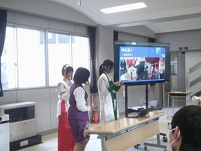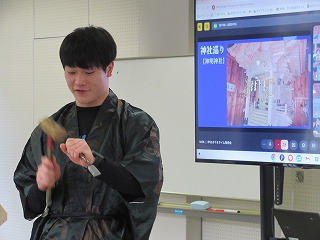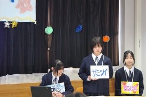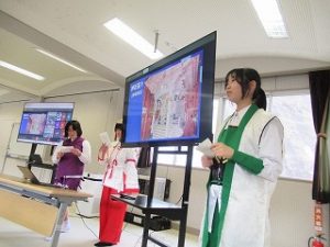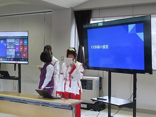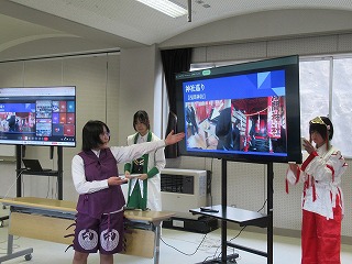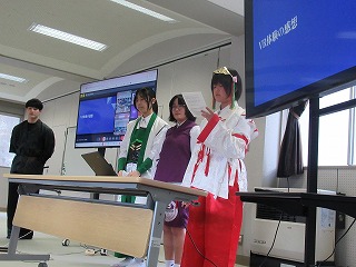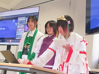 都留文科大学のお力を借りて、雛鶴姫伝承をVR動画にするまでの様子の紹介と、雛鶴姫にまつわる伝承が残る神社の見学を行った様子を発表してくれました。VR動画の作成では、本格的な動画編集ソフトを使わせていただき、少しユーチューバーになった気分を味わえたことや、想像以上にクオリティーの高い作品ができたことなどが語られました。また、神社の紹介コーナーでは、綴連王や息子の持敏王や太郎丸、木花咲耶姫などが登場し、当時の様子を寸劇で再現してくれました。