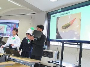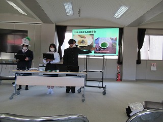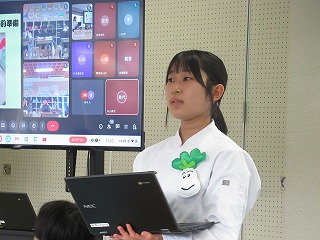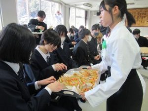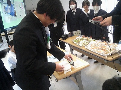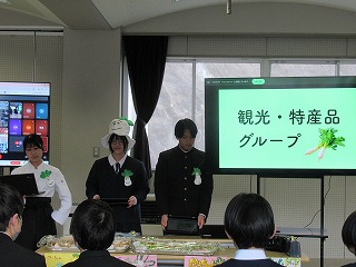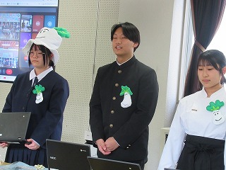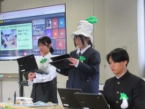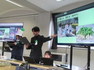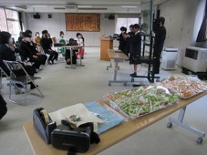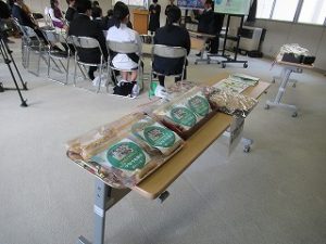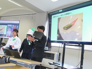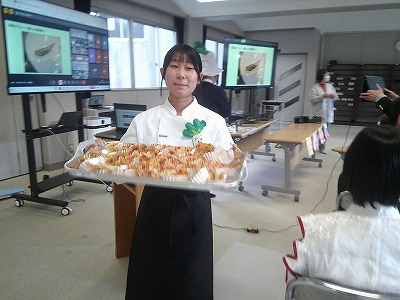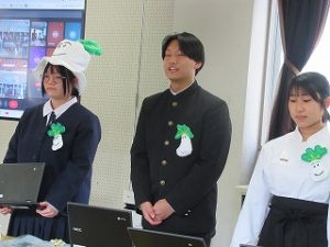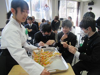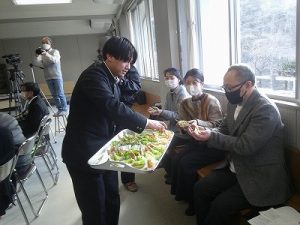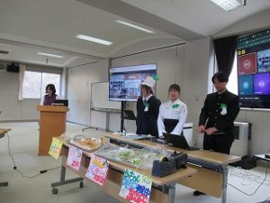都留文科大学あきやまがかりさんとコラボした新酒饅頭の開発についてと、長かぶフェス(長かぶコンテスト)の取り組みや、商品作りについての発表がありました。大学生と楽しく調理した様子や、フェス当日の長かぶの審査と表彰の様子などが紹介されました。また、ひなづる漬けの加工場を開設した五十嵐シェフのお料理の紹介とともに、実際に今日の午前に生徒が調理した「長かぶの春巻き」が試食として振る舞われ、大好評でした。