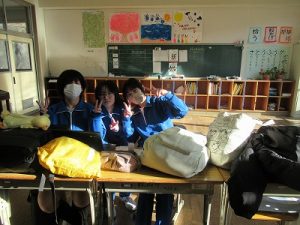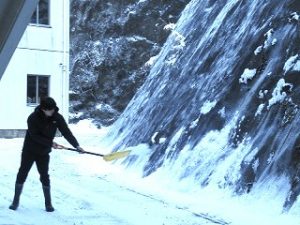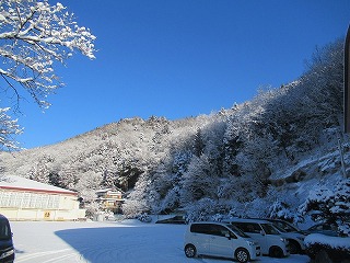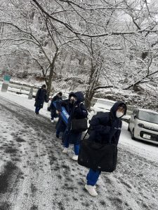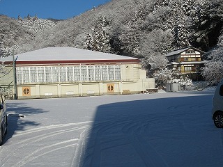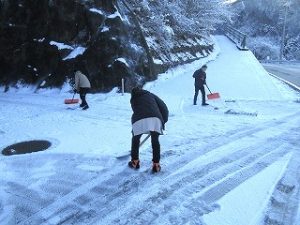 今朝の秋山は7時半の気温が-9℃と、今季一番の寒さとなり、土日に降った雪が日陰や校舎周りにガチガチに凍り付いて残っている状態でした。登校時の安全を考慮して2時間遅れ措置をとり、出勤した先生方は生徒の通り道や給食車の通路の雪かき作業を行いました。