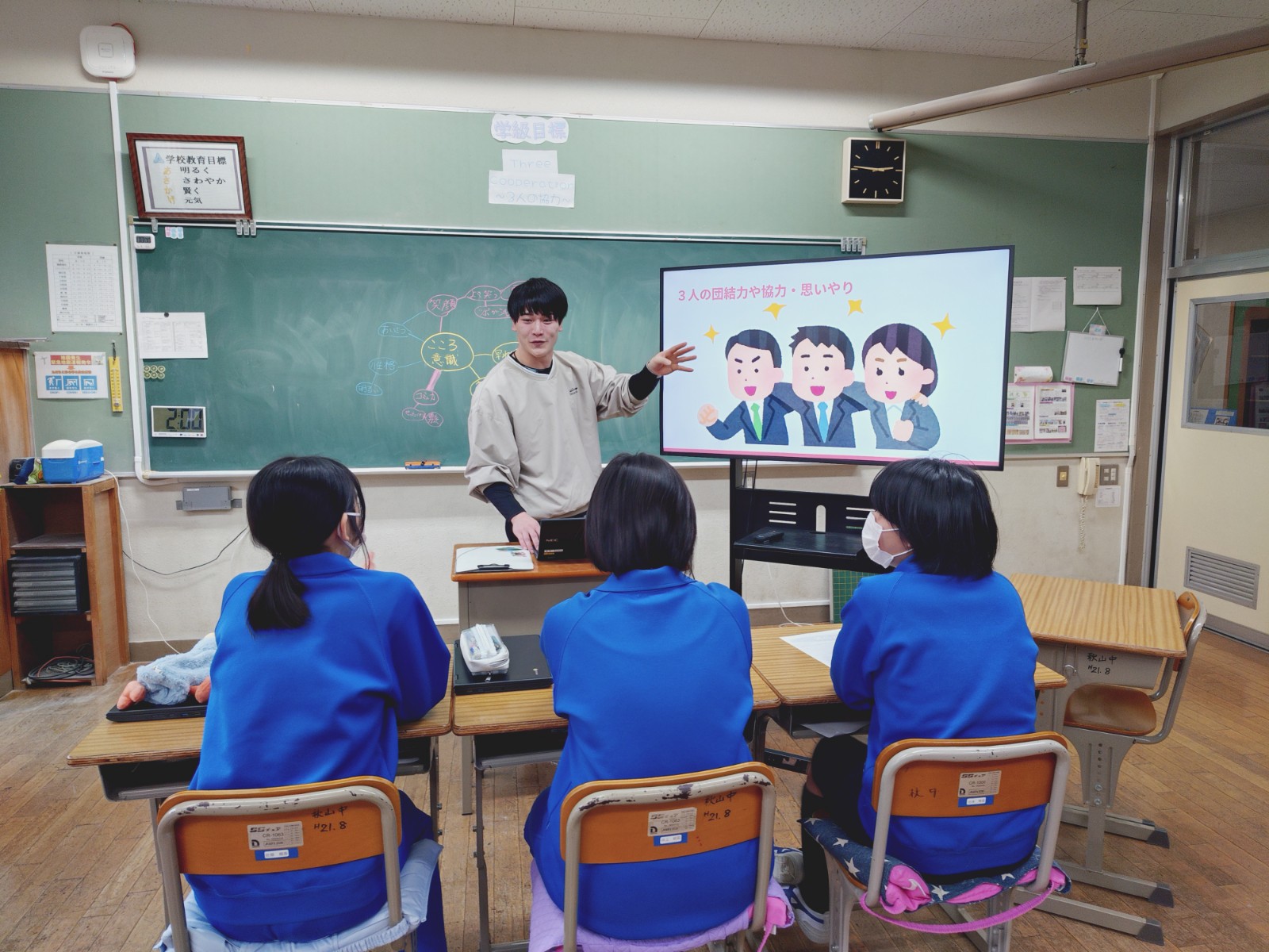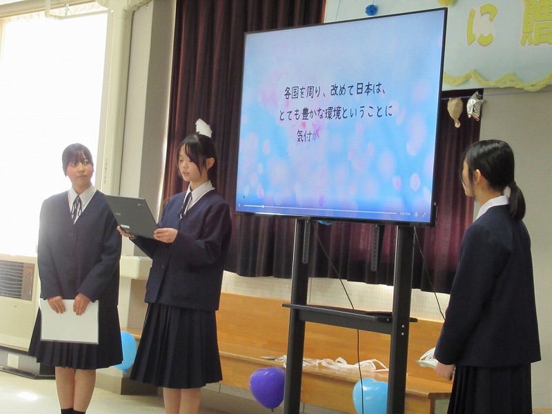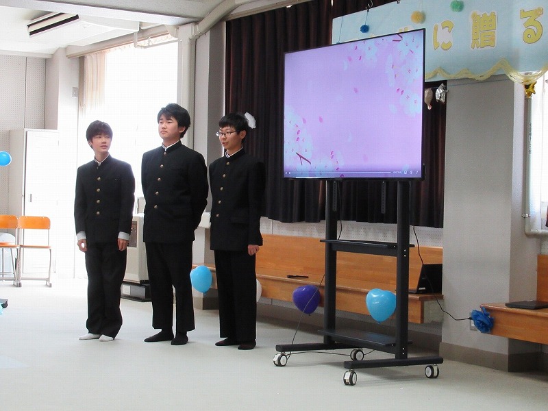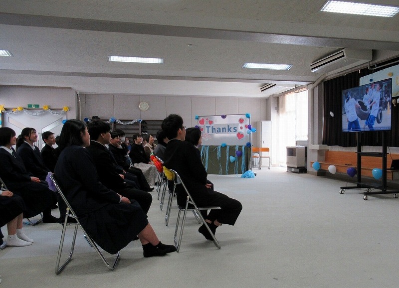 スライドでは、男子3人が頑張って制作した思い出のスライドが上映され、3年生も色々なリアクションをしながら楽しんでいました。