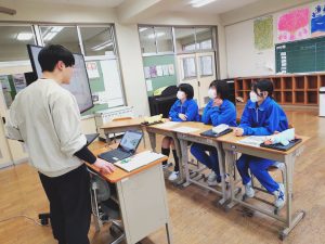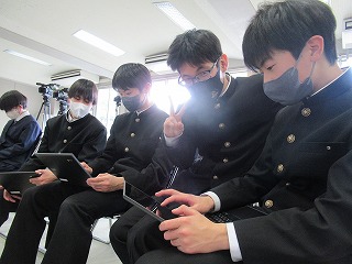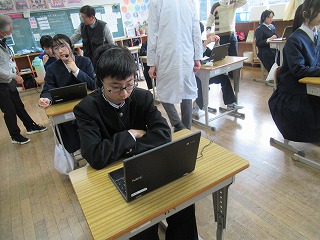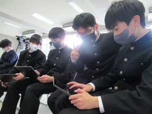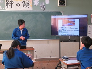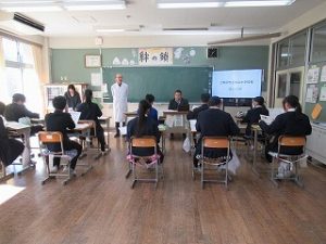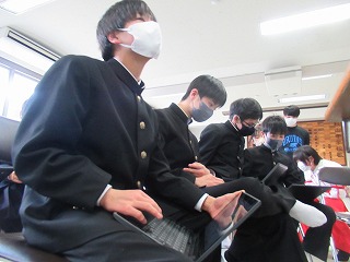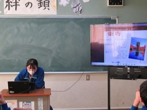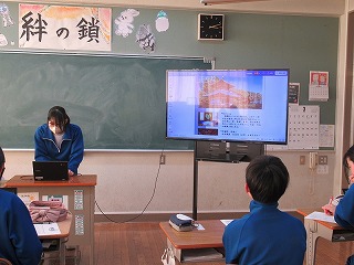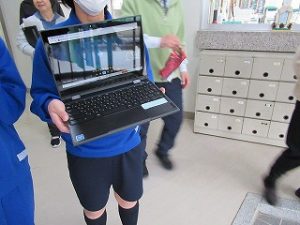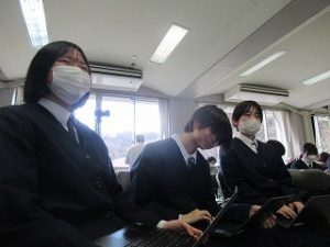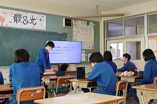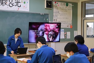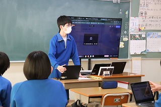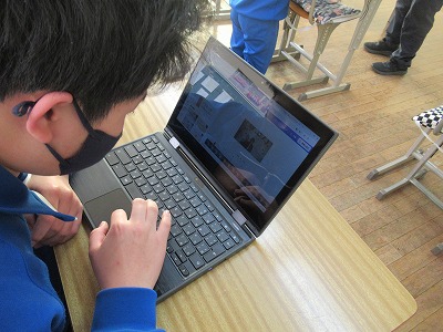 3年生が学活の時間にICT支援員さんから、これまでの学習成果データファイルの保管方法についてレクチャーを受けていました。中学校までは市から貸し出されたパソコンを使っていますが、高校からは各自私物の端末を使うことになります。3年生が中学校のクロムブックを使うのもあと少しです。