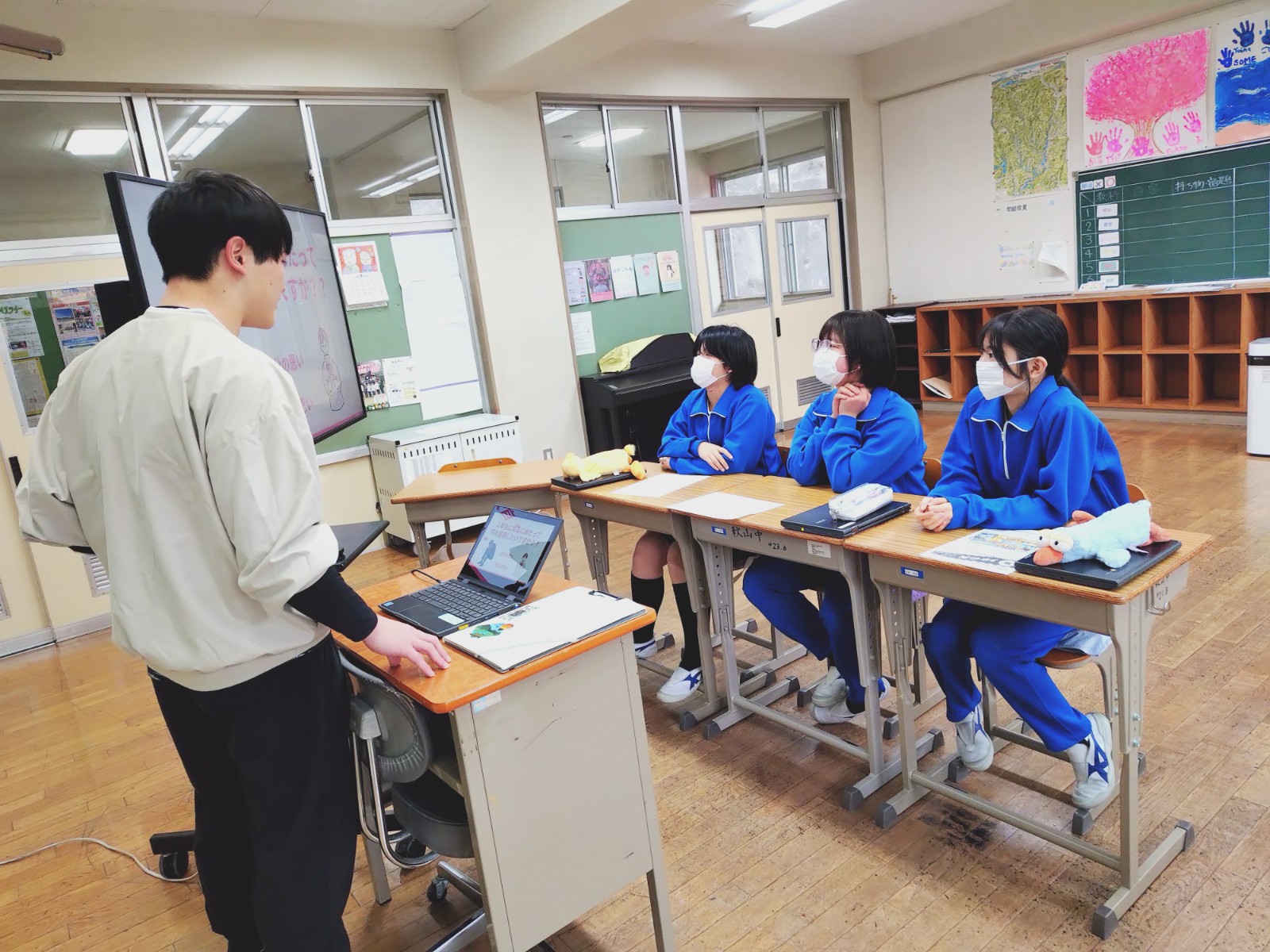 今年の発表会は、保護者やCS委員の方々にお越しいただいた他、秋山小5,6年生、都留文科大学のみなさん、政策秘書課の山田さんがオンラインでご参加くださいました。