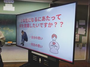 6校時に1年教室をのぞくと、楽しそうに授業をしていました。2年生になるために、さらに頑張っていきたいことを話し合っていたのかな?とてもいい雰囲気で授業が進められていました。