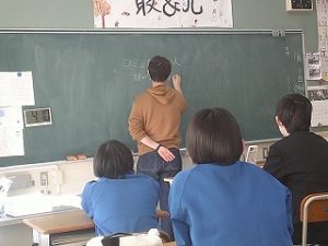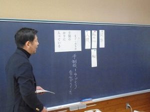 小中連携事業の一つである出前授業が行われました。6年生の国語で、内容は、「詩を読み、詩を書いて、友達の表現の良さについて語り合おう」でした。はじめに早口言葉にチャレンジするコーナーがあり、すっかり打ち解けた雰囲気になったところで、本題に。まど・みちおさんの「しまうま」の詩の題名を当てる活動をもとに、自分たちも詩を書く時に「見立て」の手法を使って書く約束をし、そして題名をかくした状態でどんどん書いていきました。3人ともすごく積極的で、思ったこと感じたことを素直に発言していて、とても活気がある授業でした。最後には「もっとやりたい!」と言ってた児童もいて、中学校進学がきっと楽しみになったことと思います。
