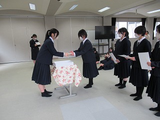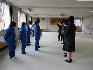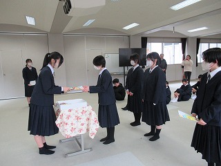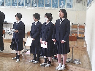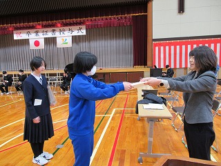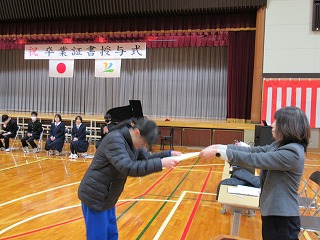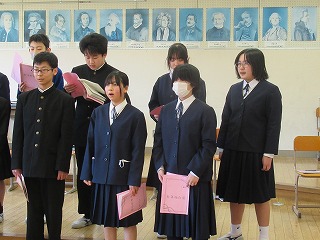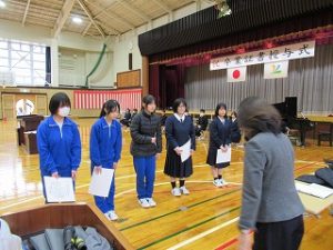 いよいよ明日は卒業式。卒業生も在校生も万全の準備を整えて明日を迎えられるよう、最終確認に余念がありません。4校時は全校で予行を行い、細かい確認を行いました。また、3学期分の表彰集会が行われ、書き初めなどの入賞者に賞状が手渡されました。