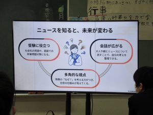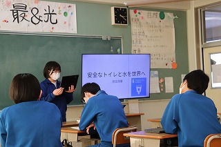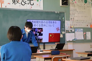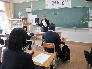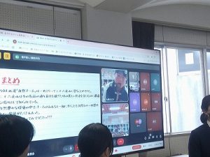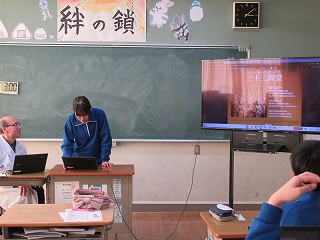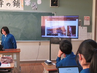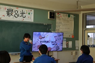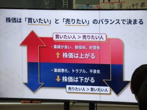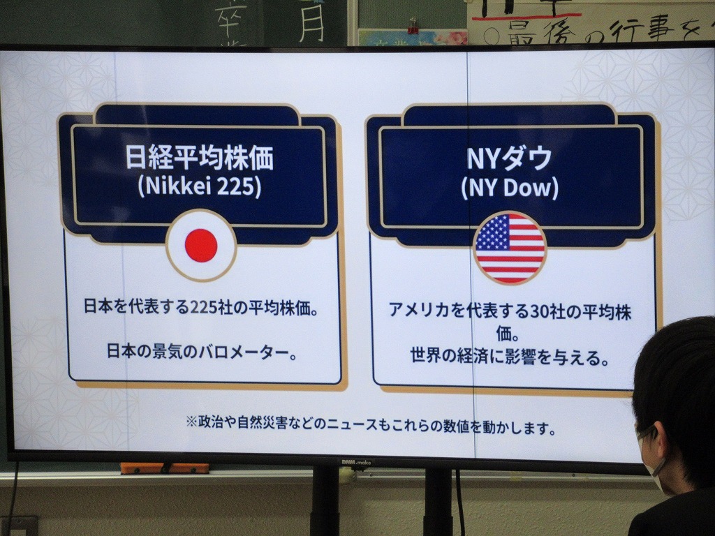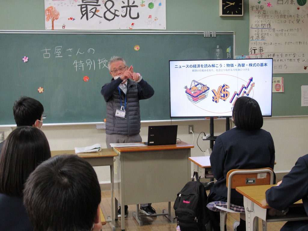 本校のICT支援員である古屋さんが、現役時代大手銀行にご勤務されていた経歴を活かして、物価や為替、株式などの金融に関する基礎知識と生活との結びつきについて教えてくださいました。社会科の授業で学んだことをもとに、それぞれの項目を解説してくださったほか、ニュースや社会情勢に日頃から関心を持つことが、自分の生き方にもつながることを教えてくださいました。