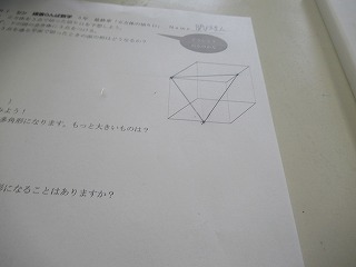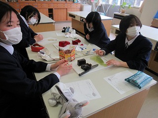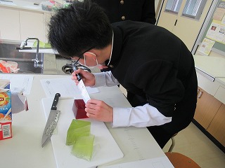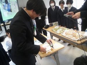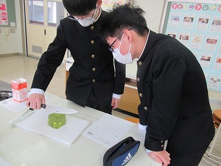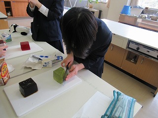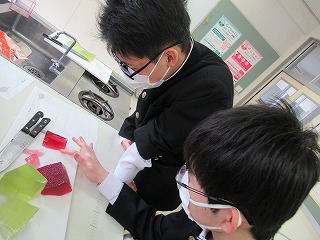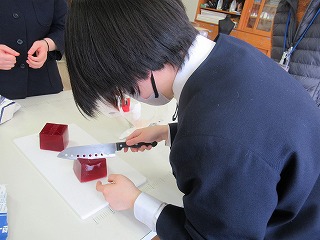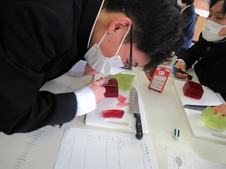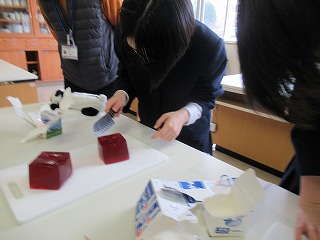 3年間の数学もあと少しで終わり。そこでS先生がゼリーを使い、おいしく食べながら図形を学べる授業を行ってくれました。予め作っておいた立方体型のゼリーに切り込みを入れたとき、どんな切片になるか形を予想し、実際に切って確かめていました。予想通りの形になったり、少し切り方を間違えてしまったり・・・。でもみんな楽しみながら実習していました。