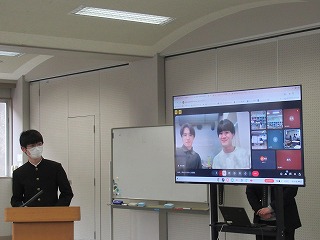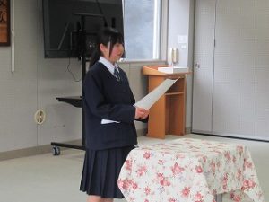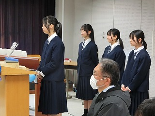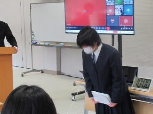 後半は、2年生の生徒会長から、先日参加した「市長さんと語る会」での本校からの提案内容と市長さんの答弁について報告がありました。とてもわかりやすい報告でした。