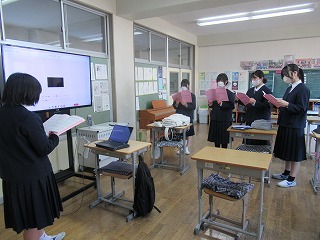 明日、北都留地区中学校英語暗唱大会に出場する生徒が、全校生徒に成果を披露しました。