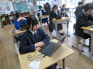 来年度4月に行われる全国学力調査の英語では、「話す」「聴く」のテストがあるため、ヘッドフォンを使用しての聞き取りや音声録音がうまくできるかを、2年生が実際にやってみて検証していました。