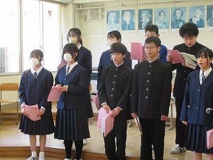 3年生は2校時に音楽があり、先日途中経過を披露した「正解」など、三贈会と卒業式で歌う合唱曲の練習に励んでいました。音楽の授業も来週が最後です...