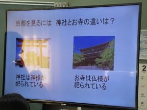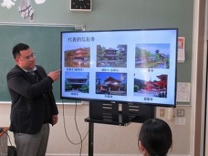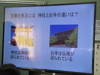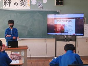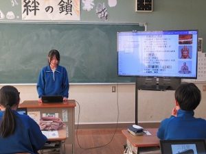 修学旅行の寺社仏閣についての調べ学習の発表会を行っていました。各自が興味を持った場所を選んでいて、有名なところからかなりマニアックな場所まで様々でしたが、どれも興味深い発表でした。