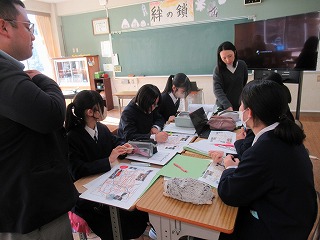 そして全校生徒が参加しての授業では、ボランティアのイメージを挙げることから始まり、ボランティアに参加したことがある生徒とない生徒が混ざったグループを作り、そこで意見交換などを行いました。経験のない生徒にとっては、ボランティアに対する垣根をはずす良い機会になったようです。また、社協の方からは、本校でもお届けしているペットボトルキャップの使われ方についてわかりやすい解説がありました。上野原市ではペットボトルキャップの寄付がここ2,3年で急増しているというお話もあり、本校の生徒たちもその一躍を担っていることを知り誇らしく思えたようです。秋山地区は地域の中で行われているボランティア活動が多いため、自分が参加している自覚がない生徒もいたりするので、今回の授業で「ボランティアは身近なもの」という思いが持てた生徒も多かったようです。