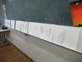 最後の授業は自分の「手」のデッサンでした。入学してすぐの時期に描いた同じ手のデッサンの横に3年後の作品が並びました。