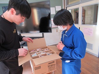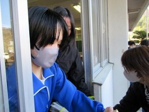 保健委員さんは、石けん補充のあと、暖房を使う準備として各教室に加湿器の配布を行っていました。