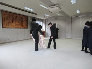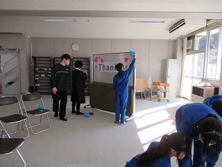 今日は入試で3年生がいないので、1,2年生は放課後、明日の三年生に贈る会に向けて会場準備と最後のリハーサルを行っていました。