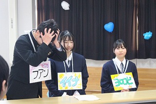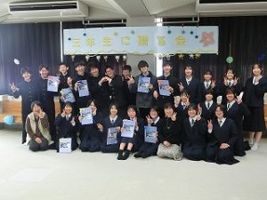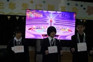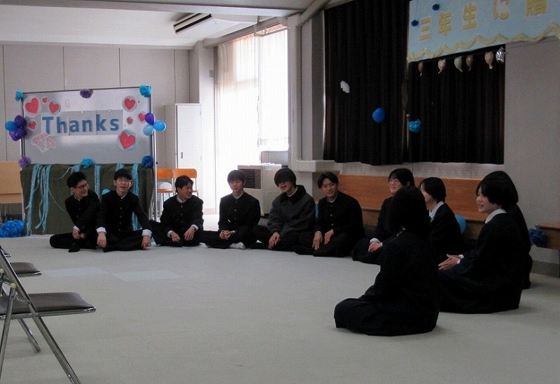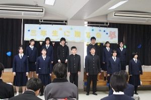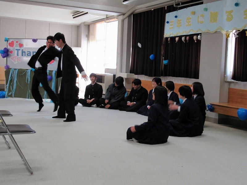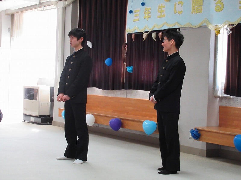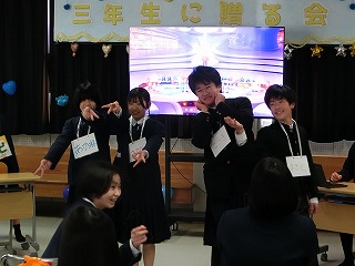 1,2年生が3年生のために一生懸命知恵を出し合って企画し準備した三年生に贈る会。司会の生徒の言葉の中には、「正直、準備の段階では大変なこともありました。」とのことで、時には困ったりした場面もあったようですが、みんなでそれを乗り越え、立派に本番を迎えました。