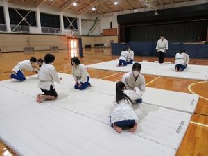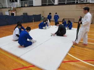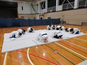 今日の体育は1,2年生合同で柔道に取り組みました。胴着は上野原中からお借りし、体育の先生がマットを敷いて即席の道場をつくってくれていて、かなり本格的に習える環境が整っていました。