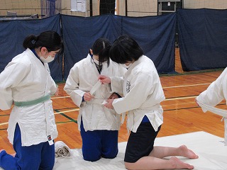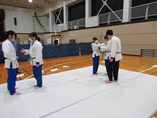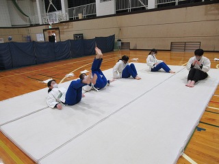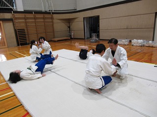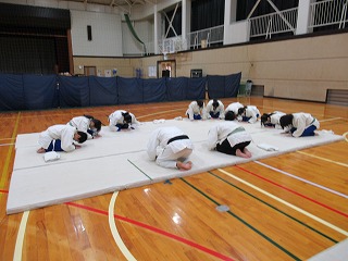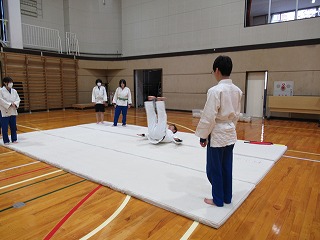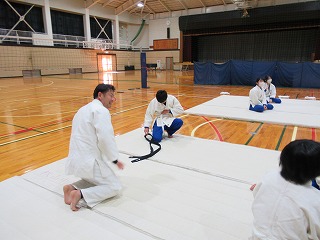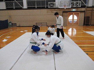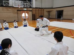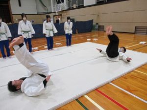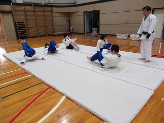 まずは挨拶の仕方や胴着の着方から教えてもらい、立ち座りの動作(武士のなごりがある)を行った後、受け身の練習に入りしました。見ていると簡単なようですが、やってみると難しく、先生にコツを教えてもらいながら繰り返し練習していました。