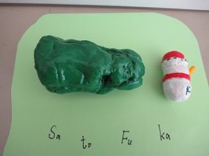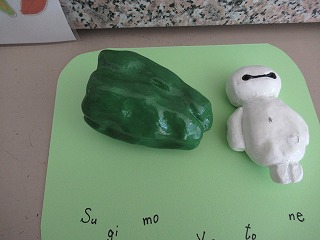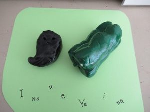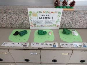 玄関に1年生のかわいい粘土作品が展示されました。ピーマンはどれも本物みたいで食べたくなります!