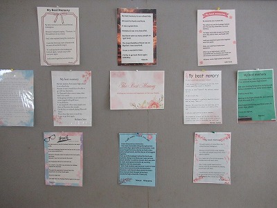3年生の廊下に、英語で綴られた「中学校での一番の思い出」が掲示されました。
