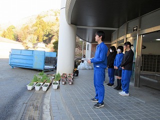 ボランティア委員会では、ペットボトルつぶしのあと、事務の先生が種から育てて下さった矢車草の苗をプランターに植え付けていました。