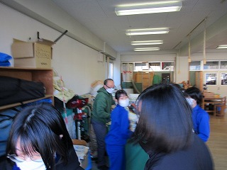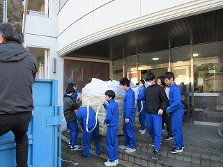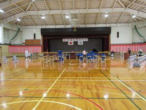 放課後体育館で、明日のふるさと祭りの会場準備が行われました。作業の前には、荷物の搬入に来た懐かしい先輩の顔も見られました。明日、秋中生は合唱を披露します。