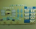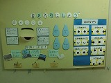 内容は、「目の仕組み」「涙のはたらき」「目の体操」等です。そして、「距離に注意!」として、テレビは2m、パソコン、ゲームは30cm、読書するときは30cm距離をとることが大切であることを示しています。実際の距離がわかりやすいように、毛糸でその長さを実感できるように工夫もしてあります。保健室を訪れたり、前を通りかかるとのぞき込んでいる子供たちの姿がみられます。