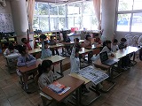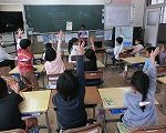 友達と頭をつき合わせて笑顔で情報交換したり、一人真剣な表情で教科書と向き合ったりする5年生の姿も見られました。子供たちも教師も一生懸命取り組んだ授業でした。また、教室ロッカーの上に、