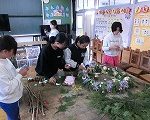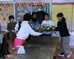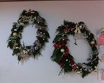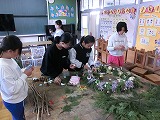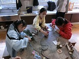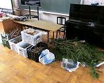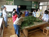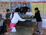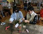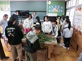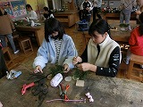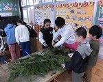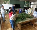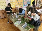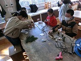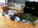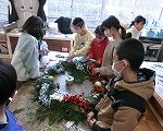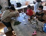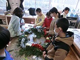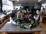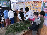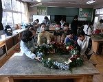 6年生は昨年も取り組みましたが、5年生は初めての体験でした。最初は二組に分かれて、もみの木をつかって大きなクリスマスリースを共同で作り、ワークスペースに飾りました。