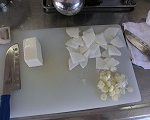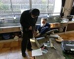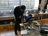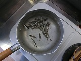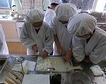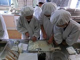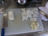 同時にお味噌汁もつくりました。具は大根、ネギ、豆腐です。煮干しの頭をとり、半分にさいて下ごしらえをしました。包丁もしっかり握り、具を丁寧に切りました。豆腐をさいの目に切るときは、家族の様子を伝え合いアドバイスし合う姿も見られました。