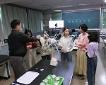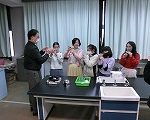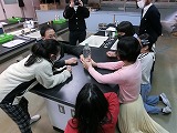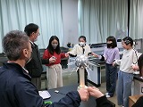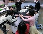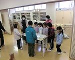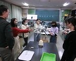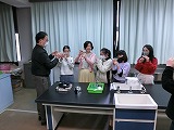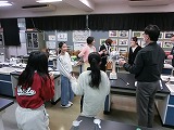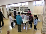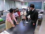 全員が手をつなぎ、静電気が伝わるか実験しました。最後の二人の手が触れあった瞬間、全員が「あっ」と言って互いの手を離しました。もう1回やってみる時も全員が恐る恐るでしたが、表情は嬉しそうでした。