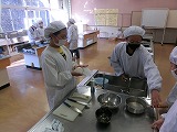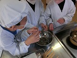 2校時が始まり、調理スタートです。計画に沿って、仕事を分担しながら作業を進めていきます。初めて鍋を使って米を炊くので、時間を計りながら気づいたこともメモしました。