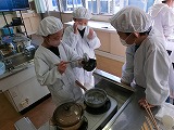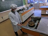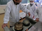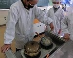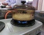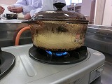 炊き始めると、すぐに家庭科室にいい匂いが広がりました。ガラス鍋を使用したので、鍋の中にはあわが広がる様子も確認でき、「すごい!」という言葉が聞こえてきました。時間を確認しながら炊いていましたが、少しすると今度は焦げた匂いがしてきました。