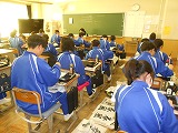 12月17日~24日まで、地域の方を招いて、全学級で書写の授業を行いました。これは、県の事業の1つである地域人材活用事業を利用したもので、生徒は、先生の話を聞きながらメモをとり、集中して真剣に書いていました。お忙しい中、お越しいただいた講師の先生に感謝申し上げます。