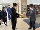 12月15日(月)、本校のボランティア委員長が、赤い羽根共同募金活動の取り組みで集まったお金を、市社会福祉協議会に届けました。