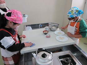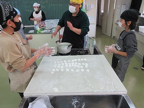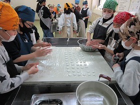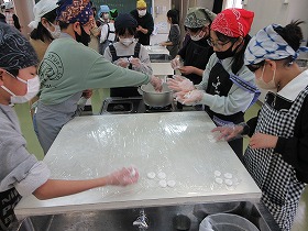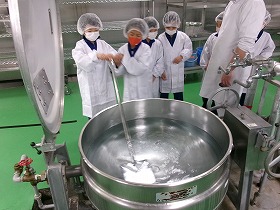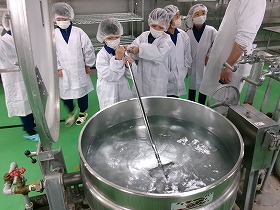 1 桔梗信玄餅の工場を見学しました。信玄餅は,人の手によって包装されています。