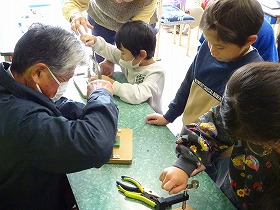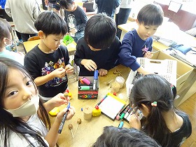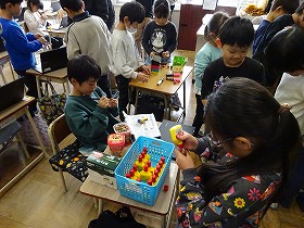5月21日(水),しおじ森の学校の下澤さんと事務局の山田さんが来てくださいました。子どもたちは,3種類のヒノキからできた積み木を使い,様々な形を熱心に組み立てていました。初めのうちは,どのように組み合わせたら良いか戸惑い,積み木をただ並べているだけの子もいました。しかし,積み木に触れているうちに,子どもたちの中から個性豊かな発想が次々と湧き上がり,作品は立体的な形へと変化していきました。そして最後には,積み木で表現された一つの大きな世界観が生まれるまでになりました。子どもたちはすっかり夢中になり,想像力を豊かに膨らませながら,積み木に没頭していました。