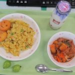 ト,豚肉と野菜のトマト煮と子どもたちの大好きなメニューで